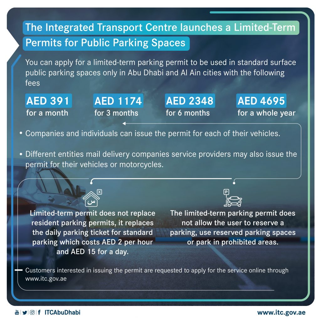 அபுதாபி இன்று முதல் ஒன்று, மூன்று, ஆறு மற்றும் 12 மாதங்களுக்கான வரையறுக்கப்பட்ட பார்க்கிங் திட்டங்களை (Limited-term Parking Permits) அறிமுகப்படுத்தியுள்ளது.