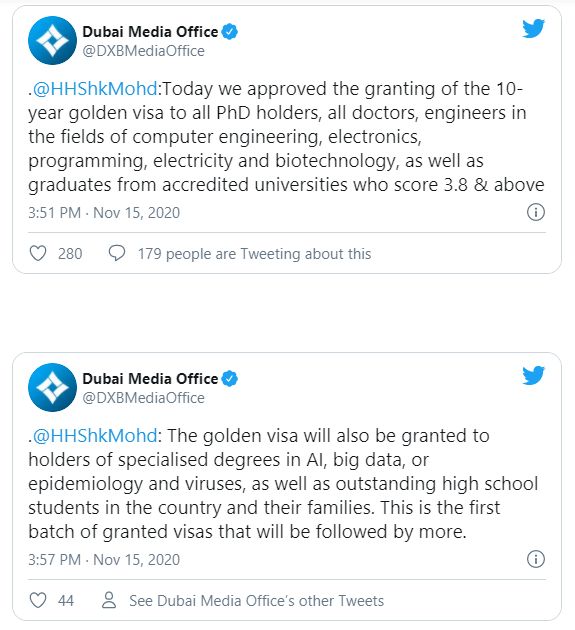 இது குறித்து அவர் ட்விட்டரில் வெளியிட்ட செய்தி குறிப்பில், “அனைத்து PhD (பிஎச்டி) பெற்றவர்கள், அனைத்து மருத்துவர்கள், கணினித் துறைகள், எலக்ட்ரானிக்ஸ், புரோகிராமிங், எலக்ட்ரிகல்ஸ், எலக்ட்ரானிக்ஸ் மற்றும் ஆக்டிவ் டெக்னாலஜி ஆகிய துறைகளில் சிறந்து விளங்கும் அனைத்து பொறியியல் பட்டதாரிகளும் இந்த புதிய கோல்டன் விசாக்களைப் பெறமுடியும்” என்று அறிவித்துள்ளார்.
